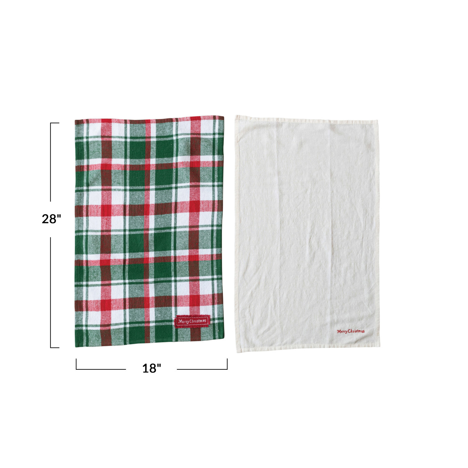 Catalog Name: 28"L x 18"W Brushed Cotton Flannel & Linen Tea Towels w/ Embroidered "Merry Christmas," Multi Color, 2 Styles, Set of 2 Tied w/ Twine & Jingle Bells