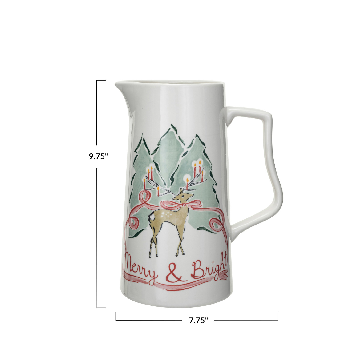 This vibrant stoneware pitcher, featuring a charming reindeer motif and the words "Merry & Bright," brings a splash of festive color and joy to any holiday gathering. With a 2-quart capacity and dimensions of 7.75 inches in length, 5 inches in width, and 9.75 inches in height, it's perfectly sized for serving up any favorite seasonal drinks or displaying a bouquet of holly and evergreens. The food-safe design ensures that it's not only a decorative piece but also fully functional for all holiday entertaining needs. Whether filled with mulled wine, spiced cider, or simply gracing the table as a decorative piece, this pitcher is sure to add a touch of merriment to any celebrations. A cheerful stoneware pitcher adorned with a "Merry & Bright" reindeer design, perfect for holiday cheer. A colorful addition to the seasonal decor, this pitcher is sure to be the centerpiece of any holiday table. This pitcher is ideal for serving holiday beverages or as a festive vase for winter blooms.