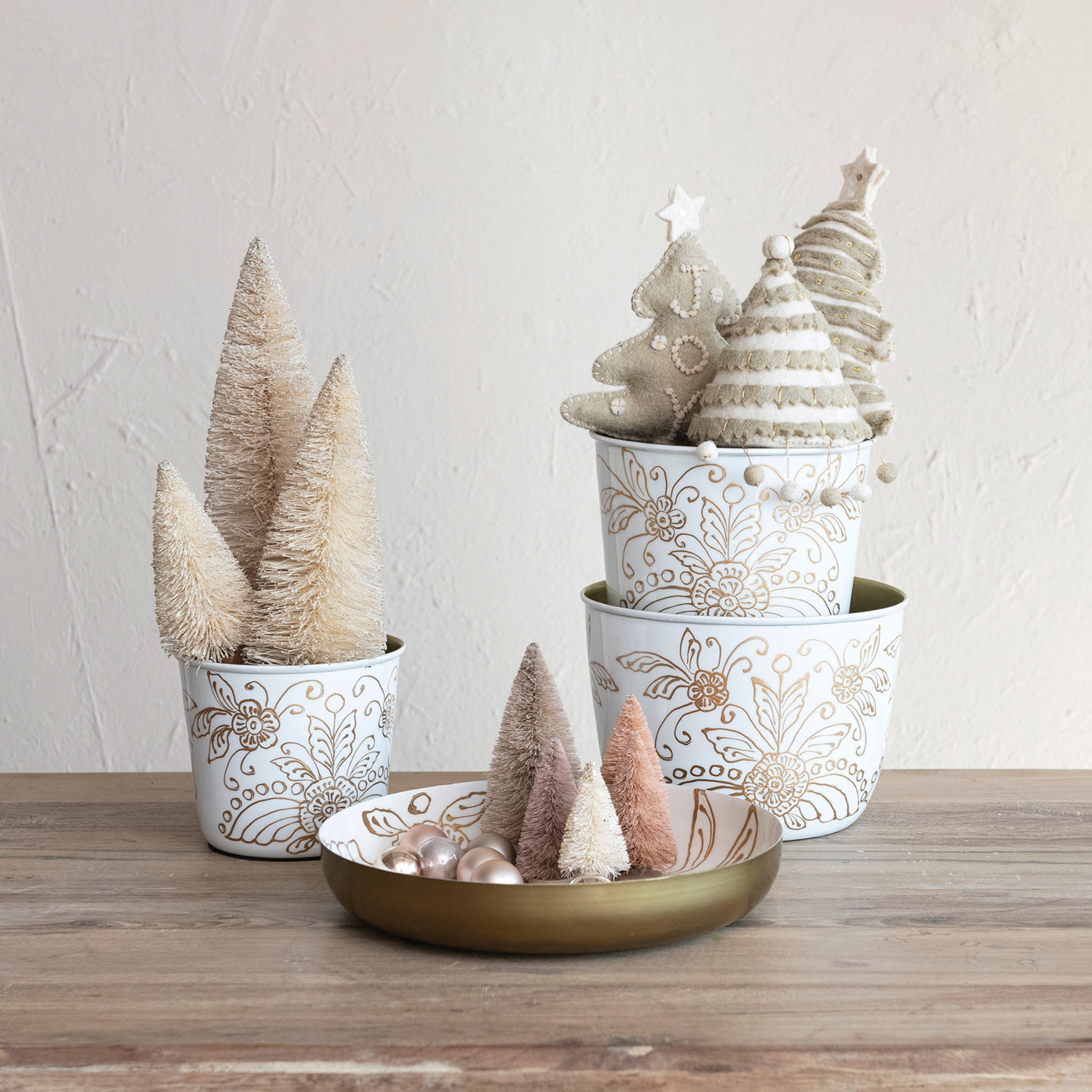 Catalog Name: 9" Round x 6-1/2"H, 8" Round x 6"H & 6-1/2" Round x 5-1/2"H Enameled Metal Planters w/ Floral Design, White & Gold Finish, Set of 3 (Holds 8", 7" & 5" Pots)