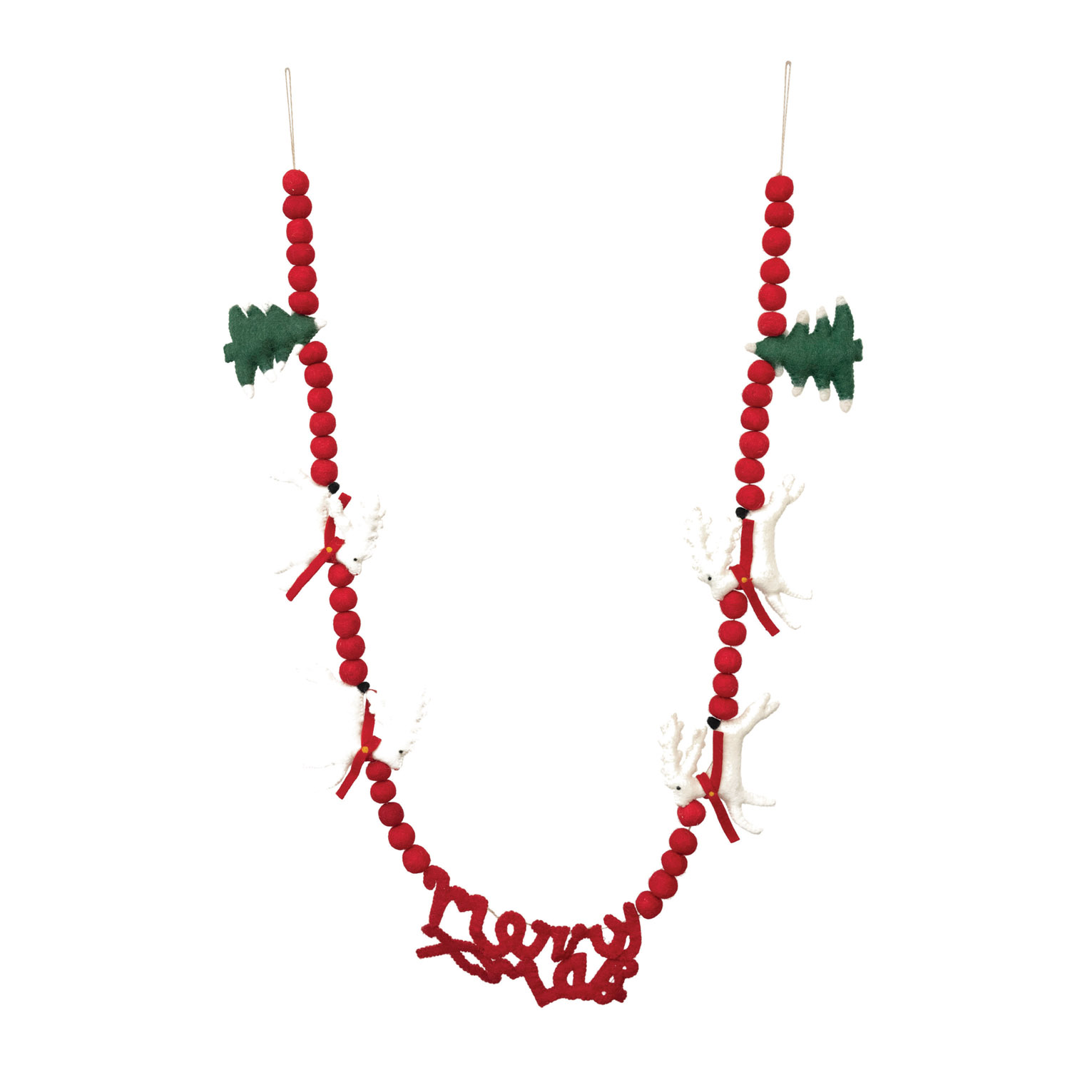 72"L Wool Felt Ball Garland with Reindeer and Trees "Merry Xmas", Red, White and Green