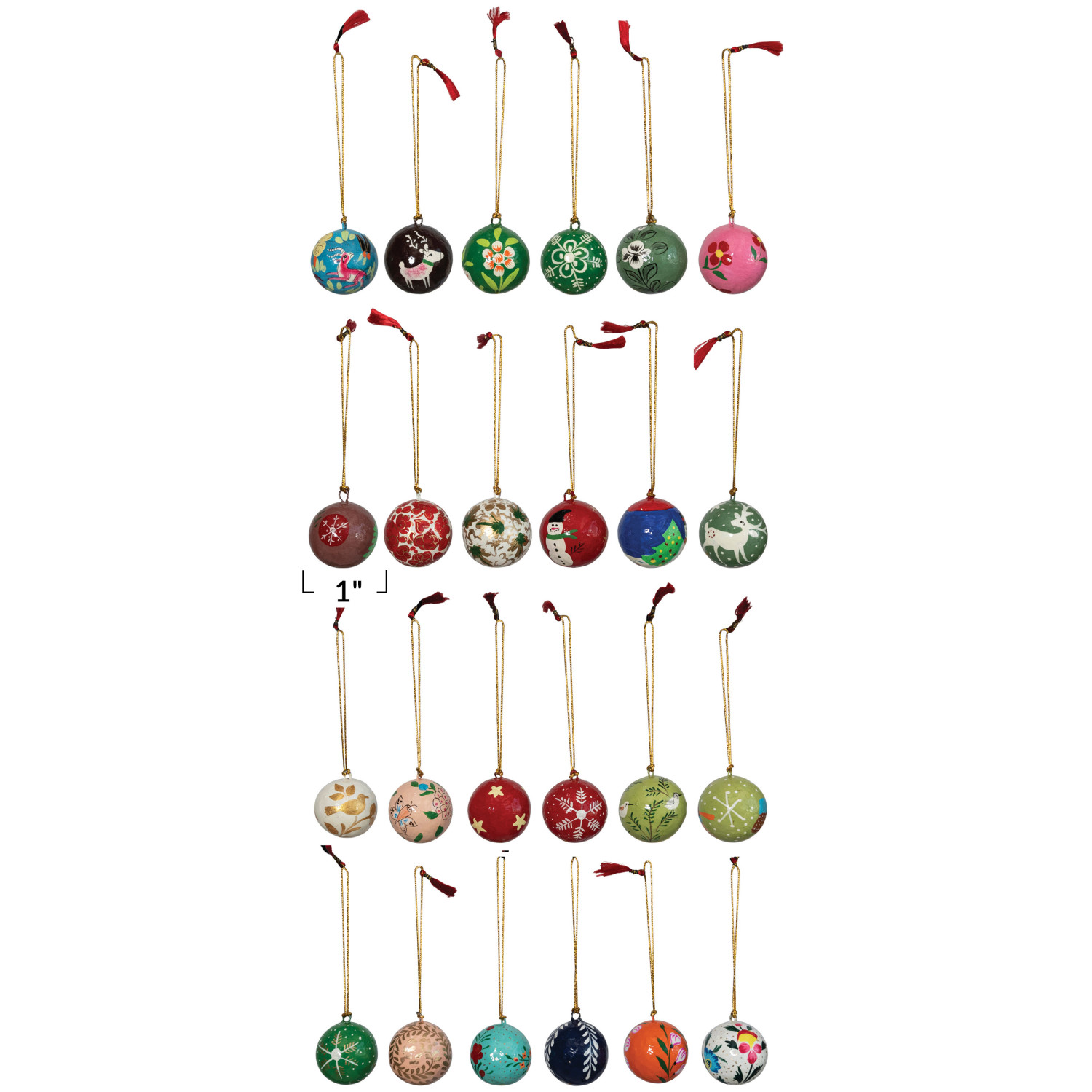 This whimsical set of paper Mache ball ornaments features 24 intricately hand-painted designs. Ornaments can be showcased as decorations on a Christmas tree, wreath, or atop a festive centerpiece, hung from doorways, displayed on mantels, used to embellish cards and presents, or given as gifts.