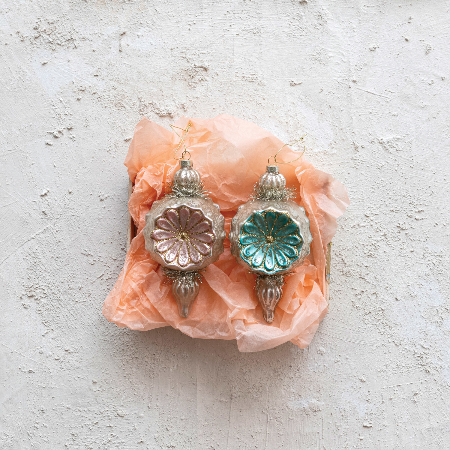 Mercury Glass Finial Ornament w/ Flowers, Tinsel & Glitter, 2 Colors