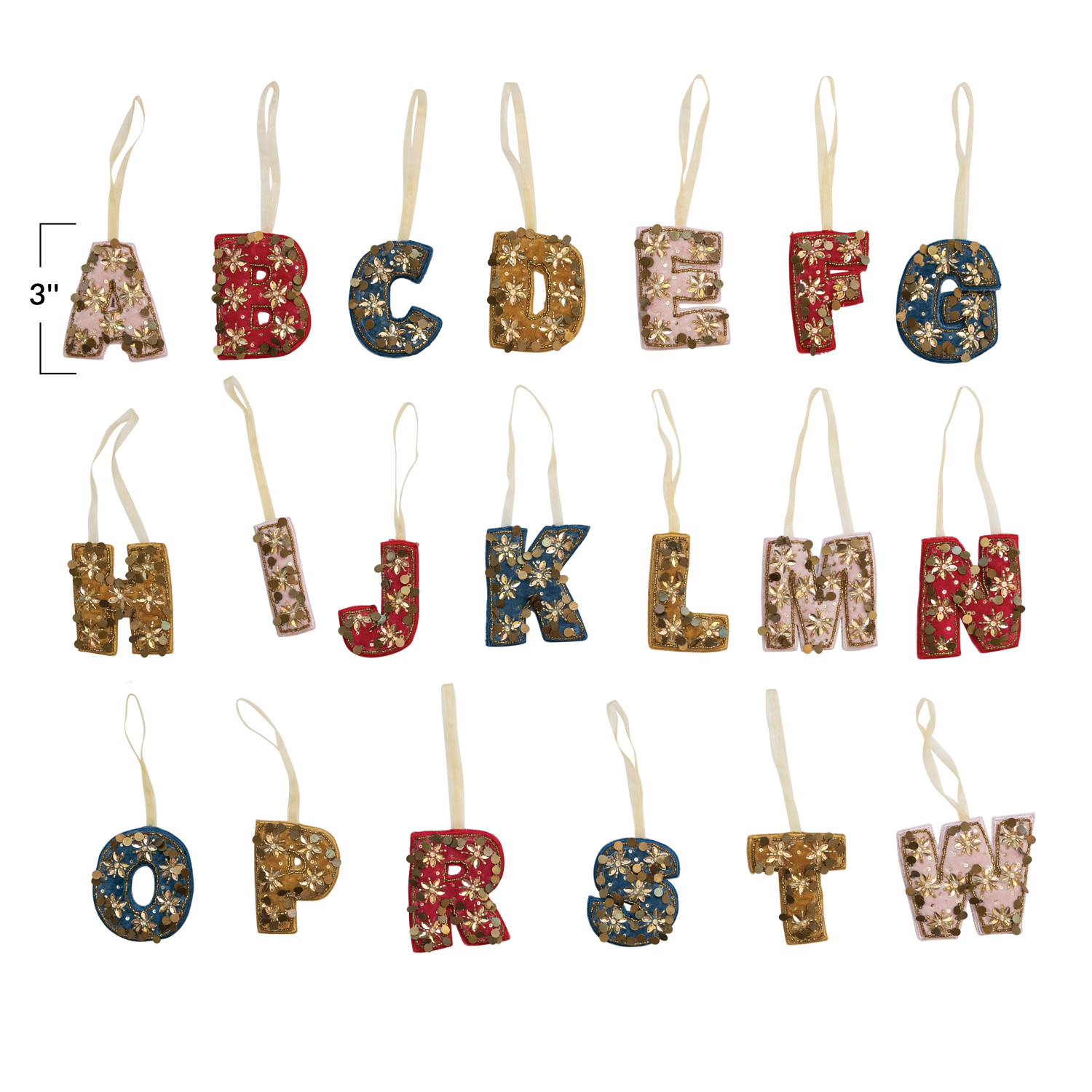 Catalog Name: 3"H Velvet Fabric Alphabet Ornament w/ Beads & Embroidery, Multi Color, 21 Styles (Assortment Includes All Letters Except Q, U, X, Y, Z)