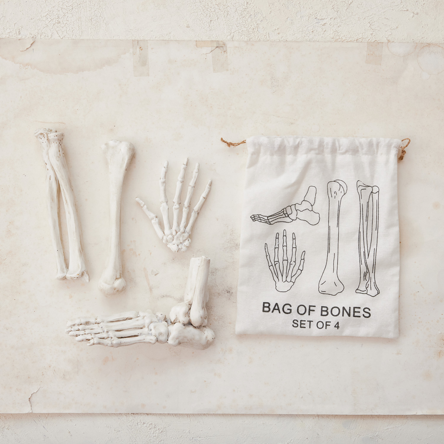 Resin Bag of Bones, White, Set of 4 in Printed Drawstring Bag
