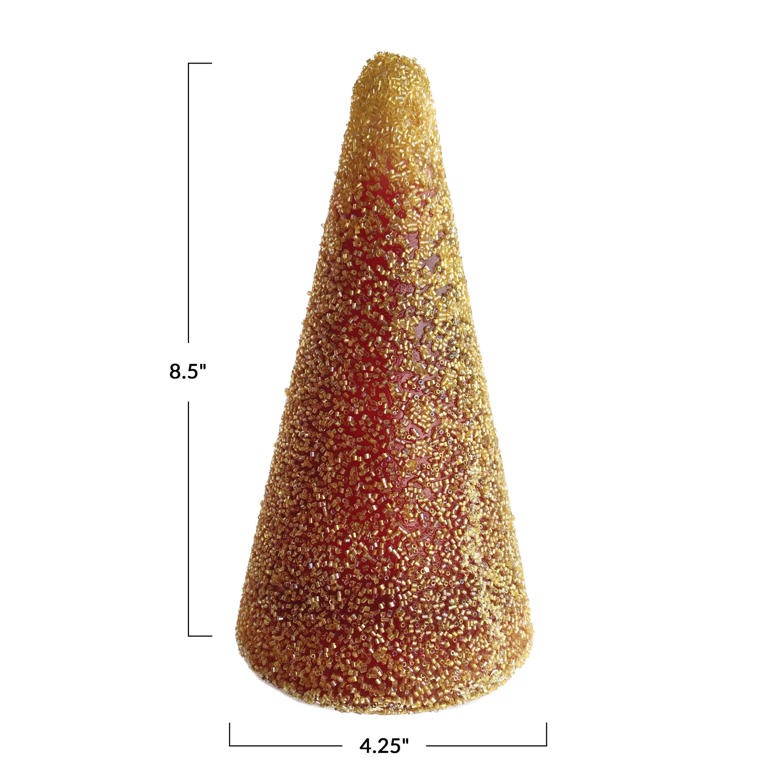 This copper and gold glass seed bead tree is a tall and elegant way to decorate for the holidays. It features a round glass seed bead tree that has a copper and gold finish and a smooth texture, creating a stunning and eye-catching effect. The tree reflects light and creates a shimmering effect in any room, adding a touch of glamour and charm to the space. The tree is ideal for displaying on a table, mantel, shelf, or window sill, where it can enhance any space with its elegance and beauty. The tree is also easy to clean and store, making it a convenient and reusable option. The tree is made of glass that is durable, smooth, and easy to clean, making it a long-lasting and high-quality option. It measures 4.25 inches in diameter and 8.5 inches in height, making it a graceful and noticeable centerpiece. Elevate the holiday decor with this eye-catching Christmas tree, adding both style and a touch of whimsy. A tall and sparkling glass seed bead tree that has a copper and gold finish and a smooth texture. A glamorous and festive addition to any holiday decor, this tree reflects light and creates a shimmering effect in any room. Ideal for displaying on a table, mantel, shelf, or window sill, this tree can enhance any space with its elegance and beauty.