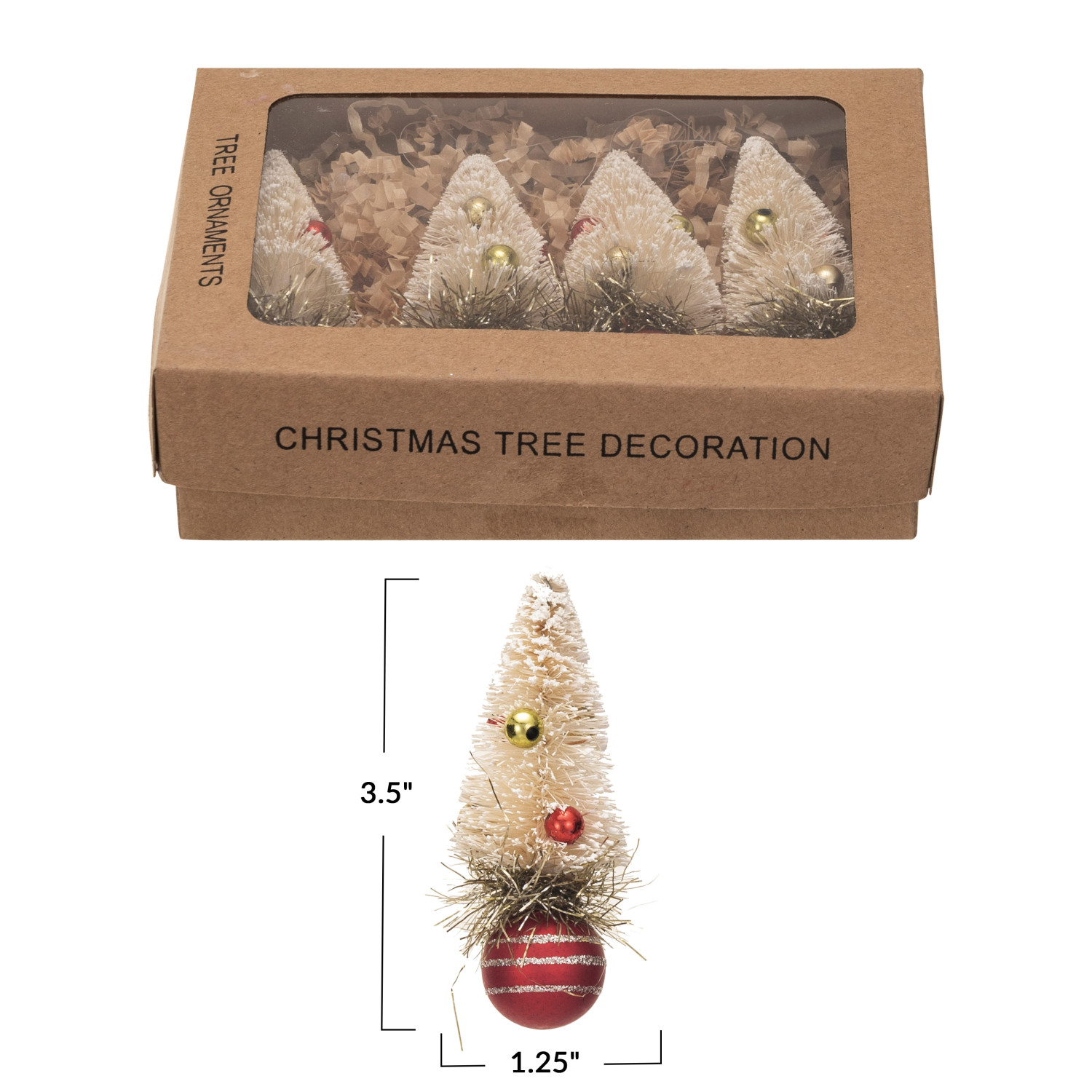 Catalog Name: 1-1/4" Round x 3-1/2"H Sisal Bottle Brush Tree Ornaments w/ Beads, Glass Ball Base & Glitter, Red & Cream Color, Boxed Set of 4