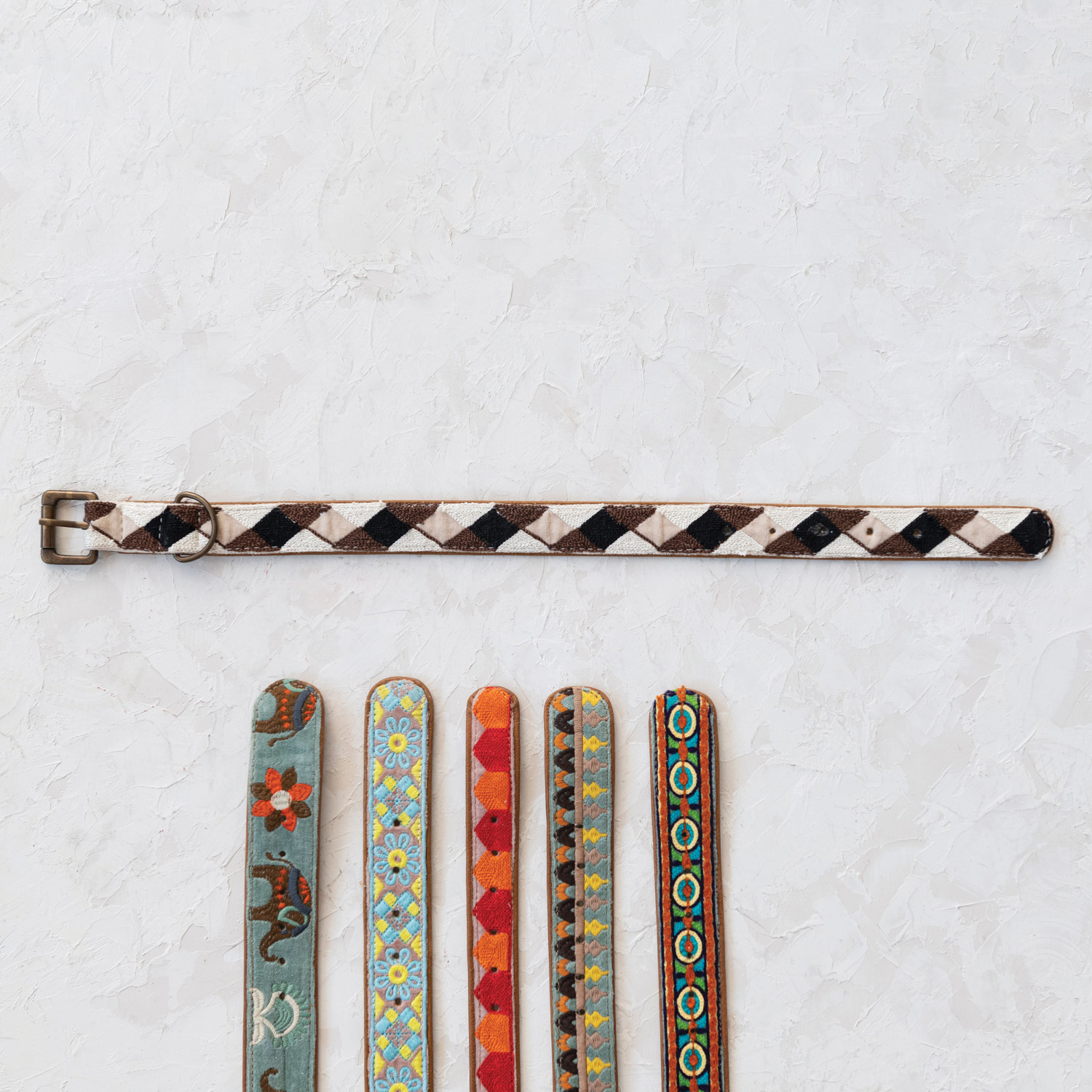 Cotton & Leather Dog Collar w/ Embroidery & Metal Buckle, Multi Color, 6 Styles, Medium