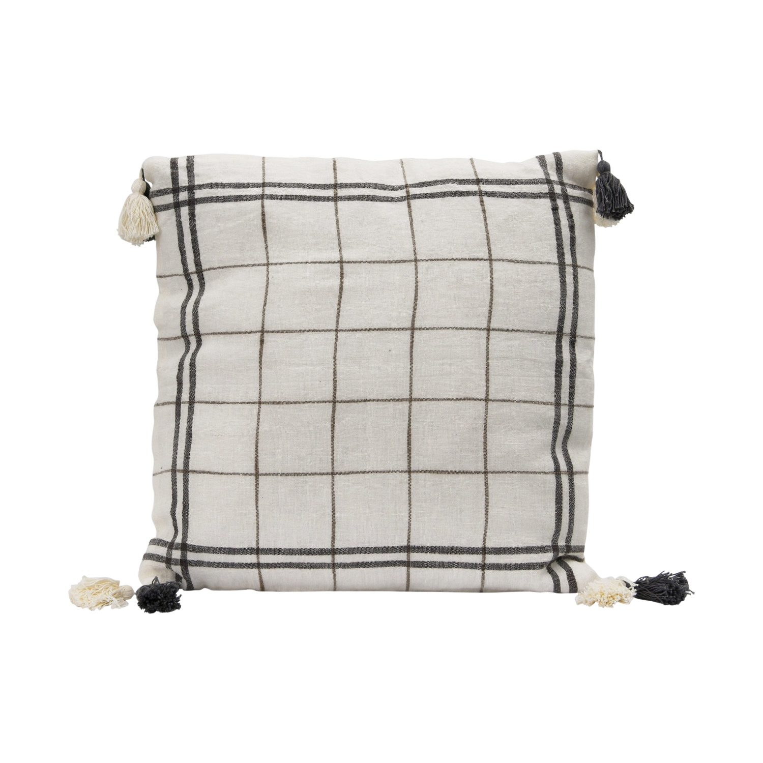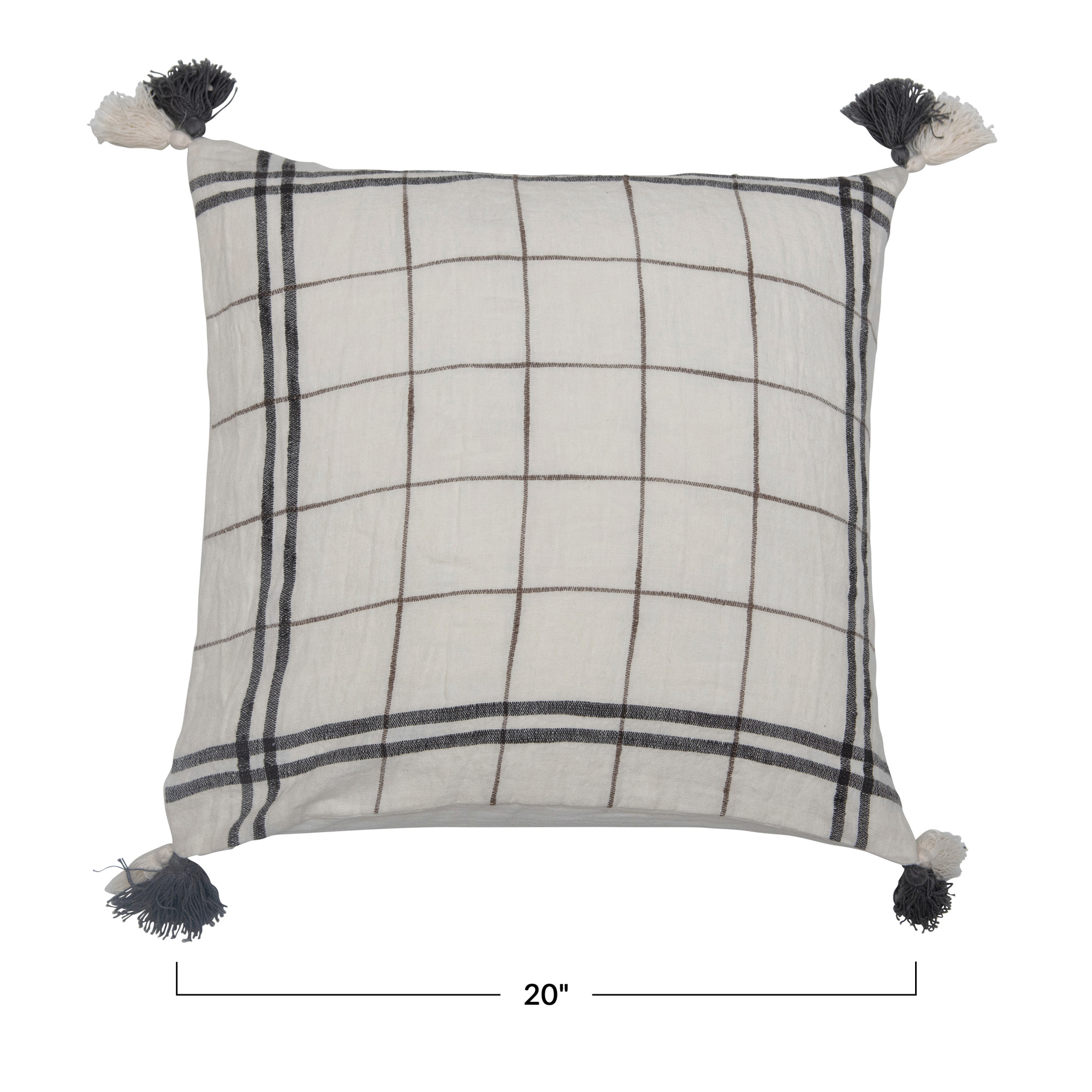 20" Linen Blend Pillow with Grid Pattern & Tassels