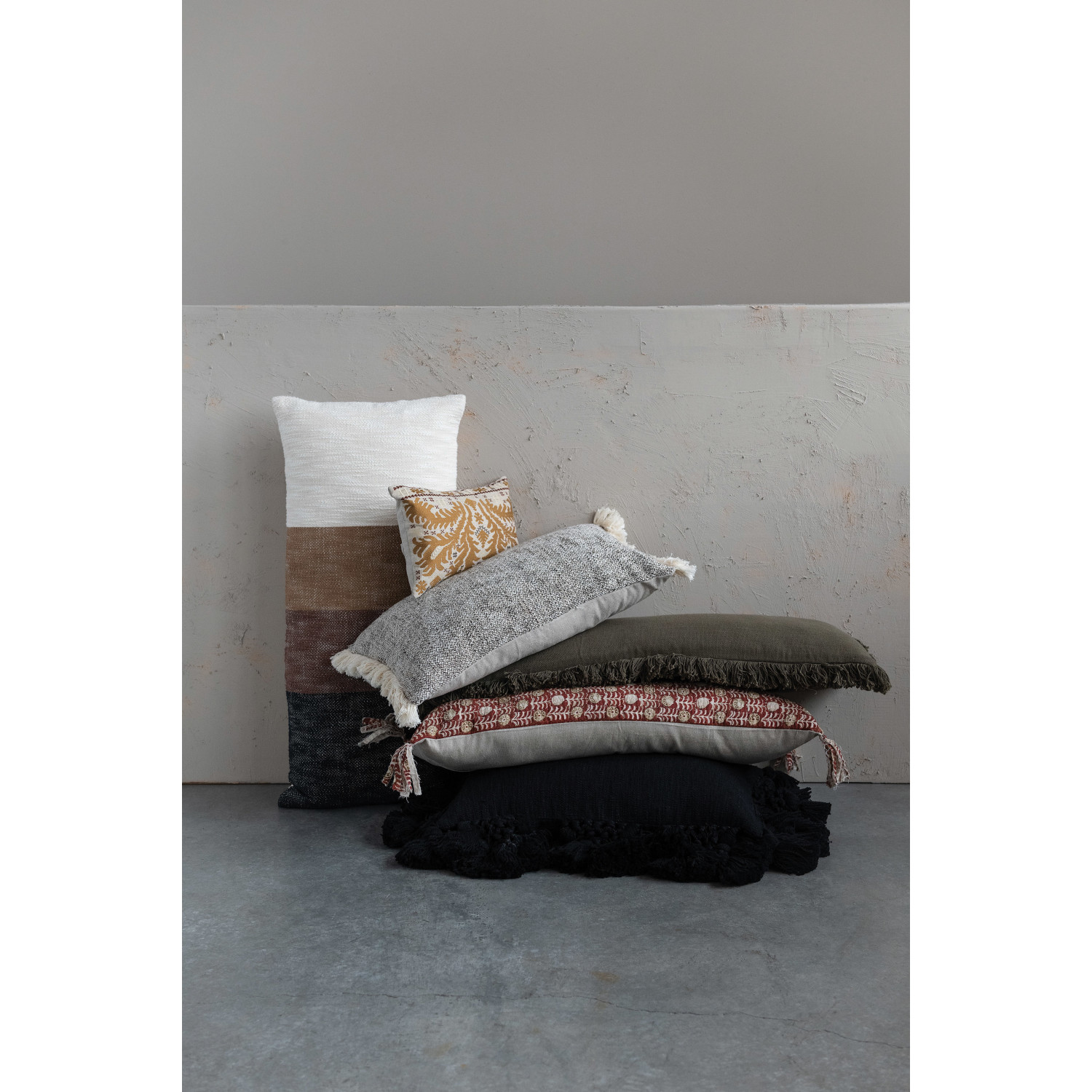 Black cotton slub lumbar pillow with crochet and tassels; Cover: 100% Cotton, Filling: 100% Polyester; 24"L x 16"W x 2"H. Prop 65 Compliant. Machine Wash Cold With Mesh Bag.