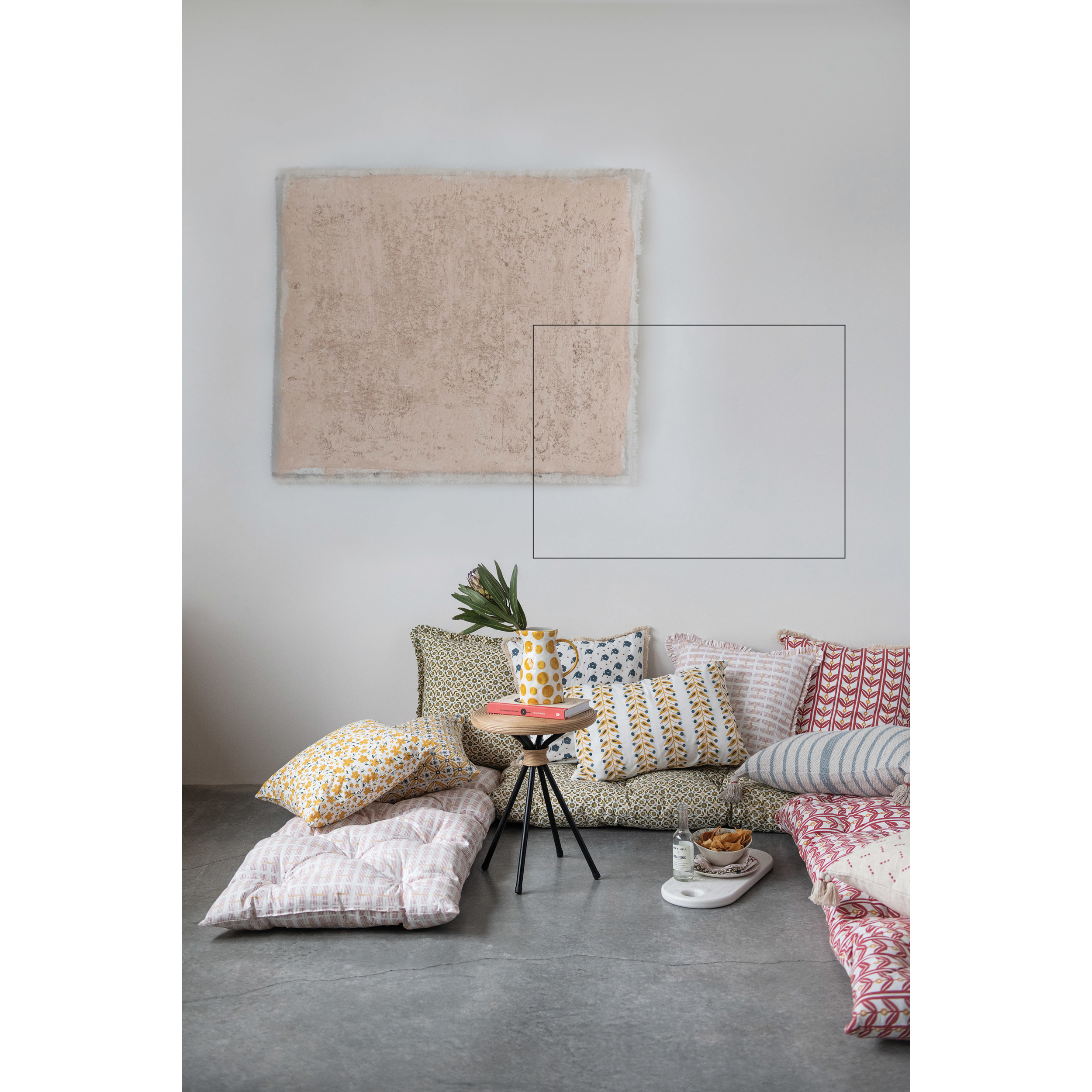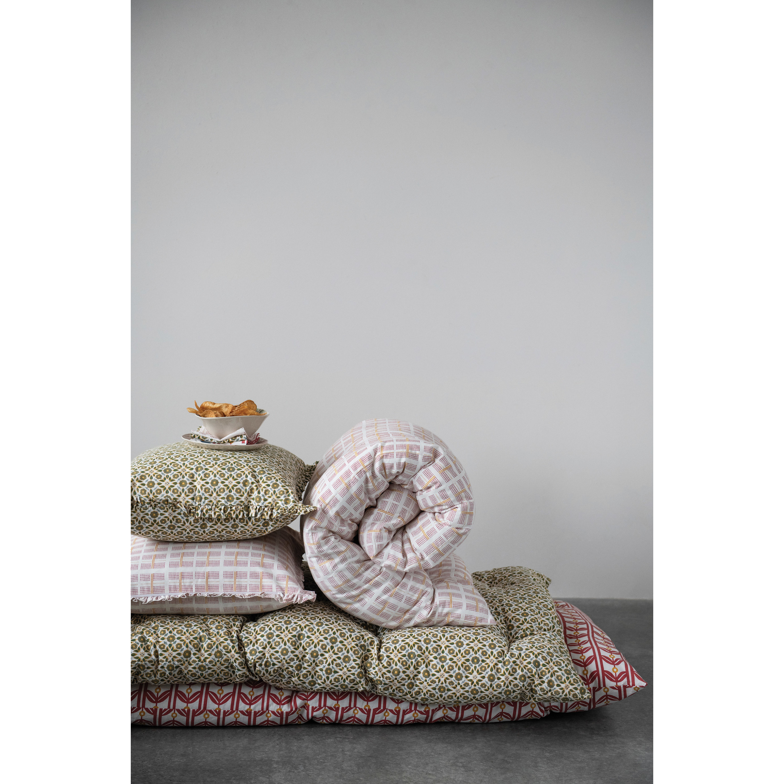 These cotton pillows instantly upgrade any couch or chair, and catches the eye effortlessly with their soft cotton construction and ruffled edges. Constructed of a removable cotton cover, for easy cleaning, with a filling made entirely of polyester. Measures 20" L x 20" W x 2" H.