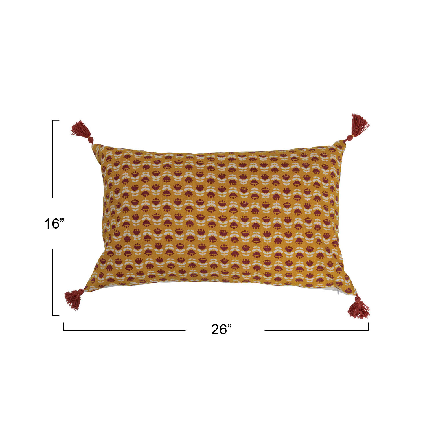 This rustic lumbar pillow showcases soft cotton slub construction with a bold floral print, finished with decorative tassels. Rust and mustard cotton slub lumbar pillow with floral print and tassels; White cotton encasement on back. Express your constantly evolving style with the simple addition of this eye-catching pillow. Removable cotton throw pillow cover and insert; Hidden in seam zipper closure; 30 degree delicate wash, do not bleach, do not dry clean, medium iron.