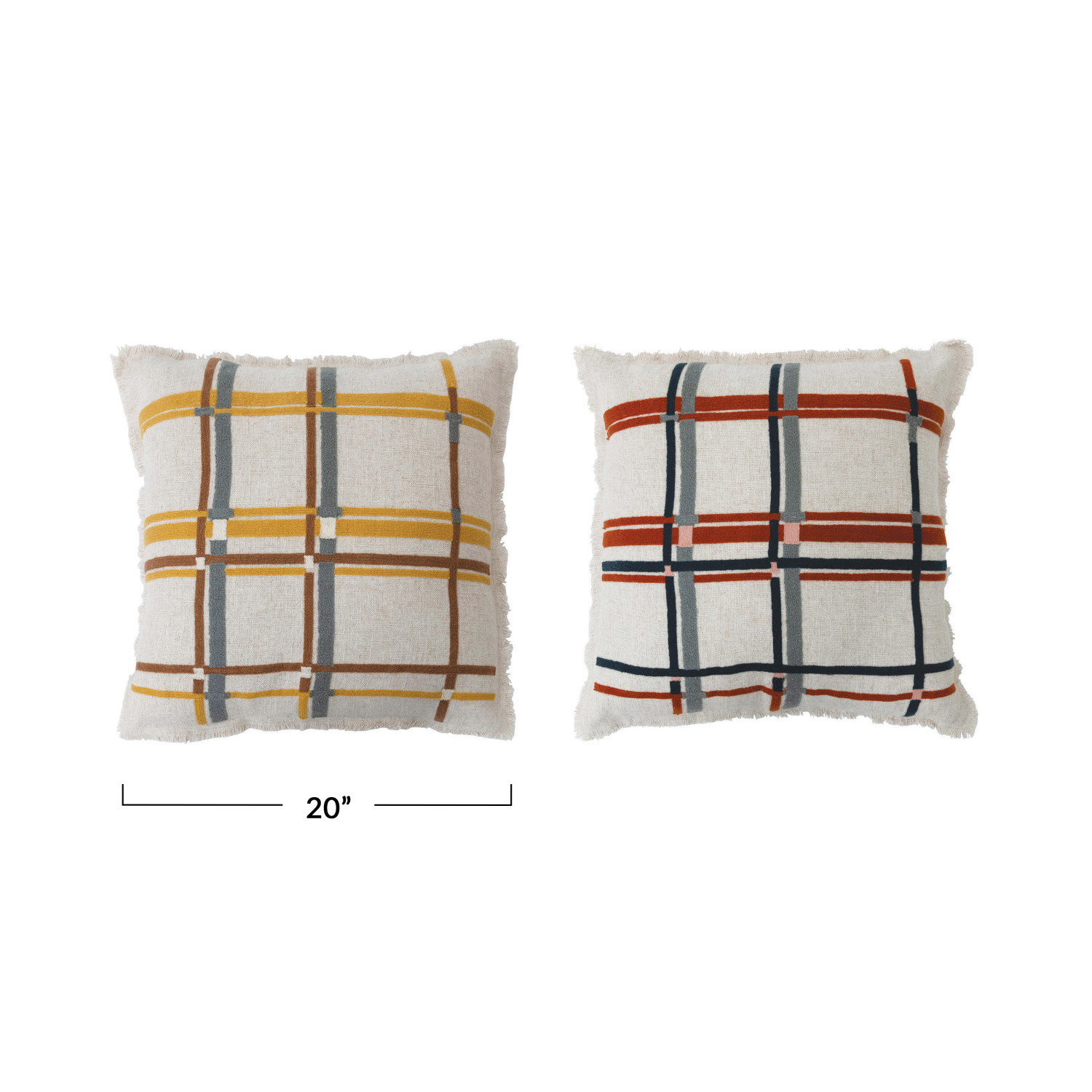 Catalog Name: 20" Square Fabric Blend Embroidered Pillow w/ Eyelash Fringe, Multi Color Plaid, 2 Colors