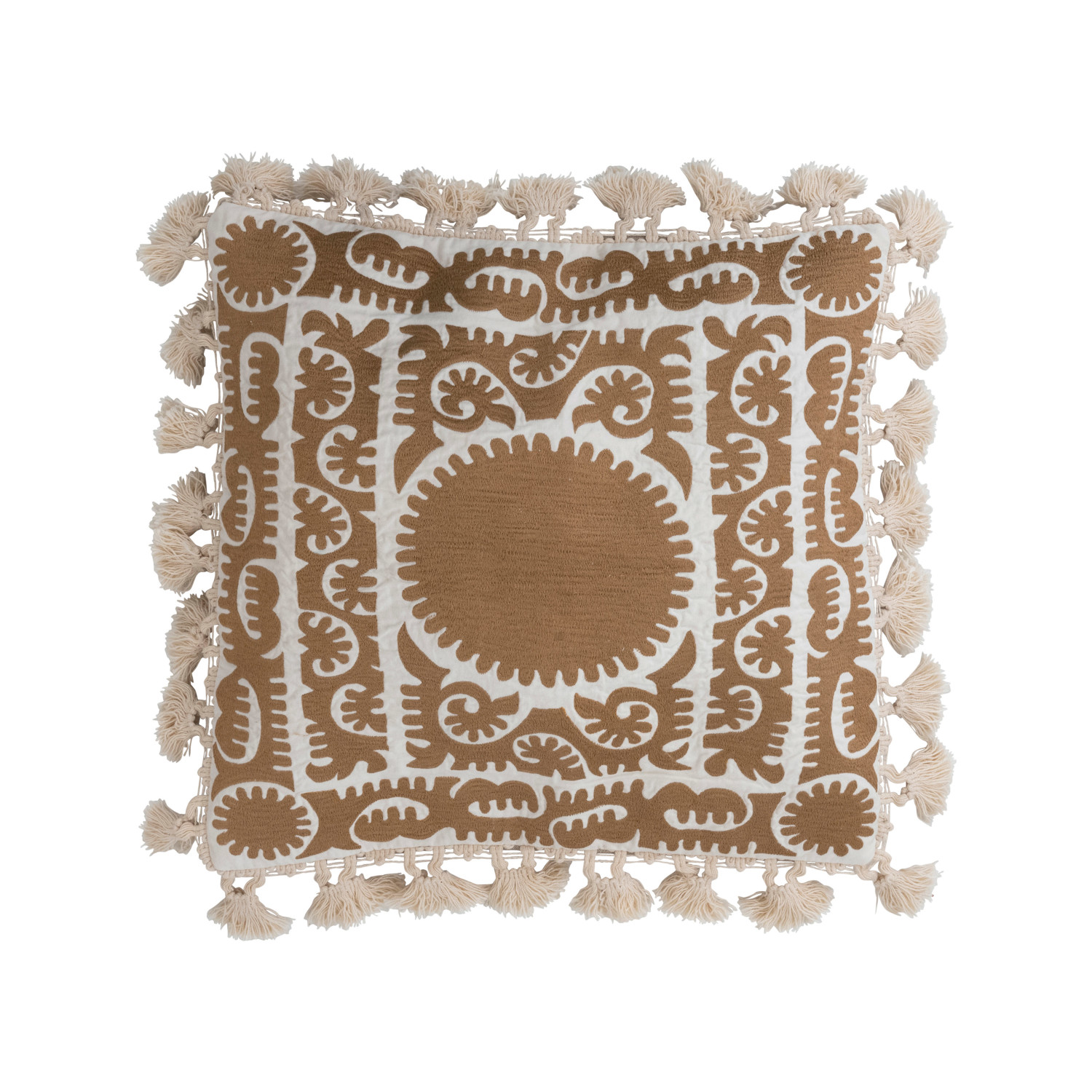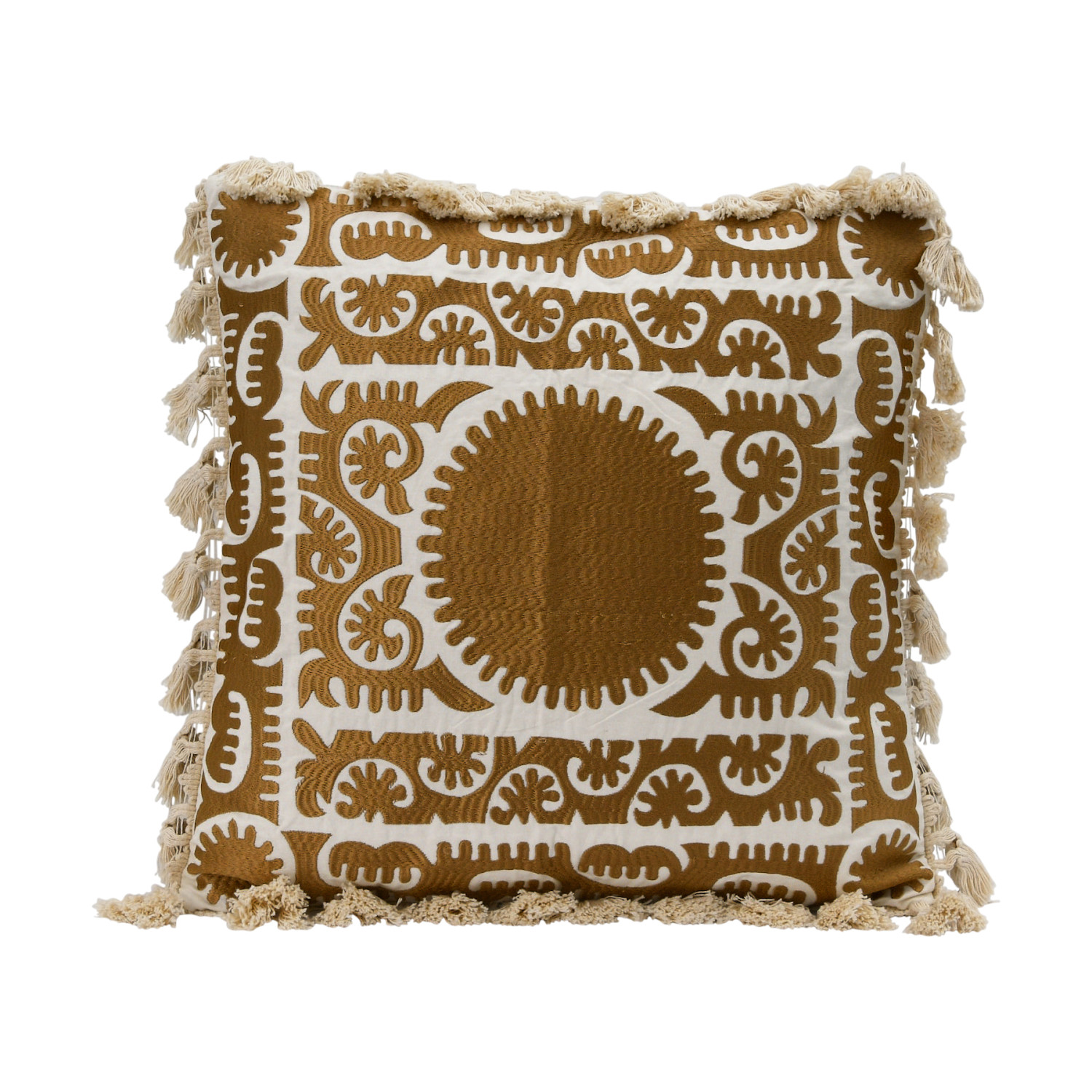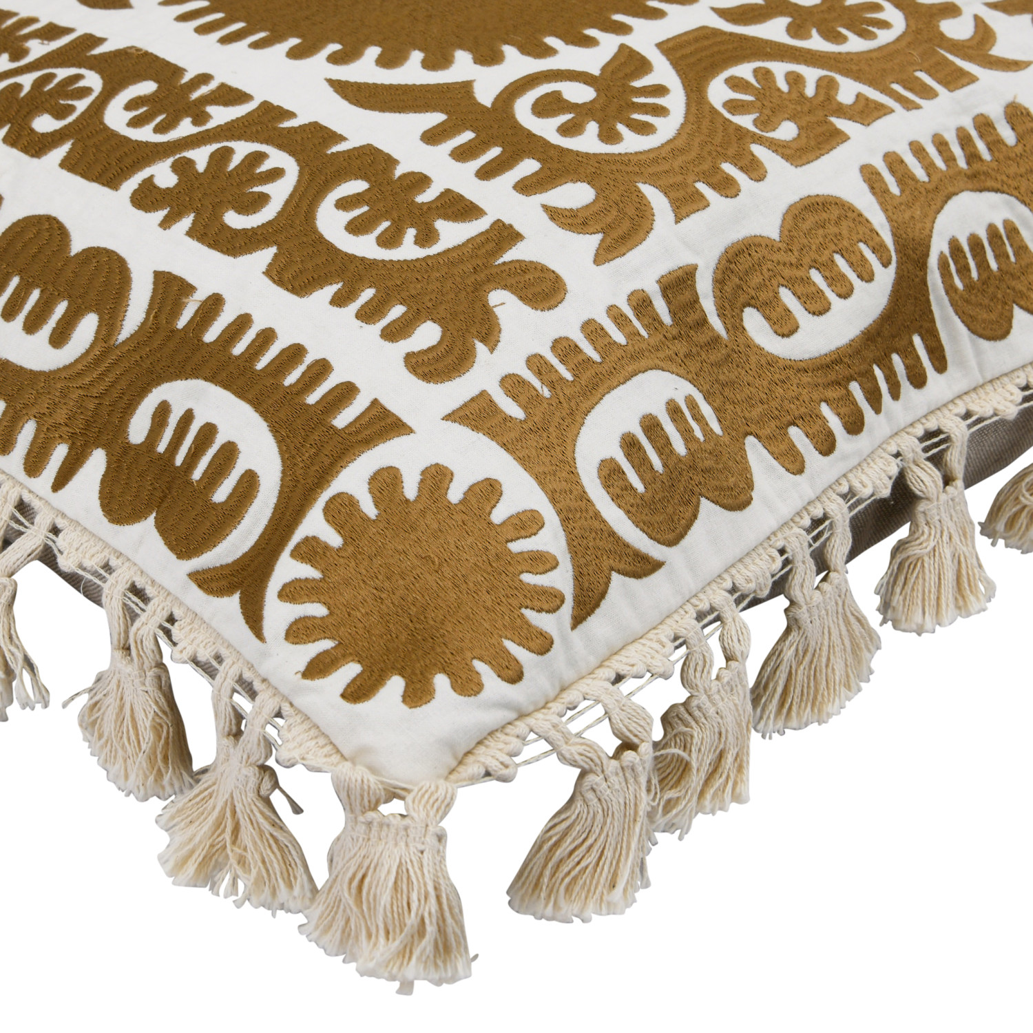 This global-inspired throw pillow cover features a bold pattern, intricately embroidered on cotton, finished with decorative tassels. Square gold and cream cotton throw pillow with embroidered print and tassels; Cream cotton encasement on back. Express your constantly evolving style with the simple addition of this eye-catching pillow. Removable cotton throw pillow cover with polyester insert; Back zipper with hidden flap; Machine wash or hand wash.
