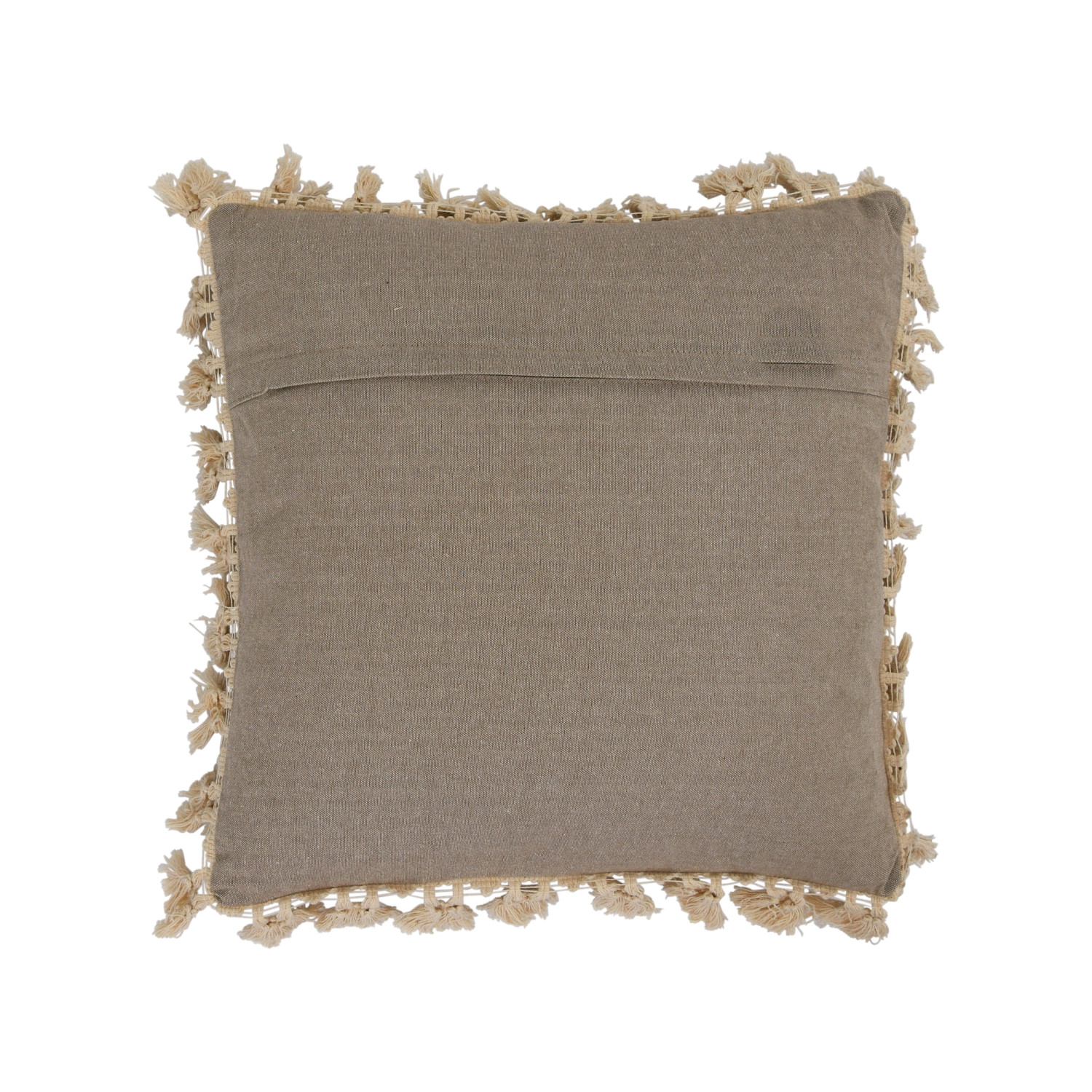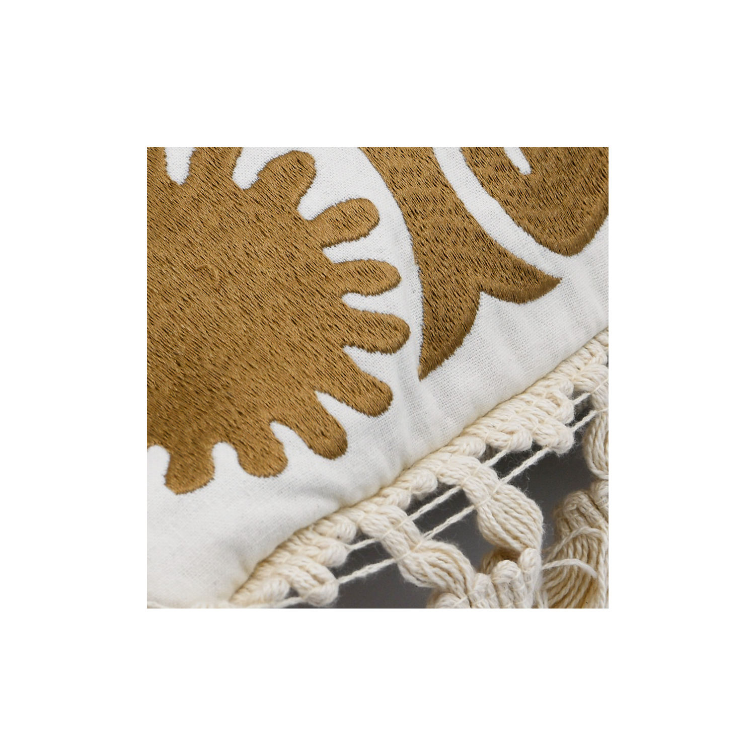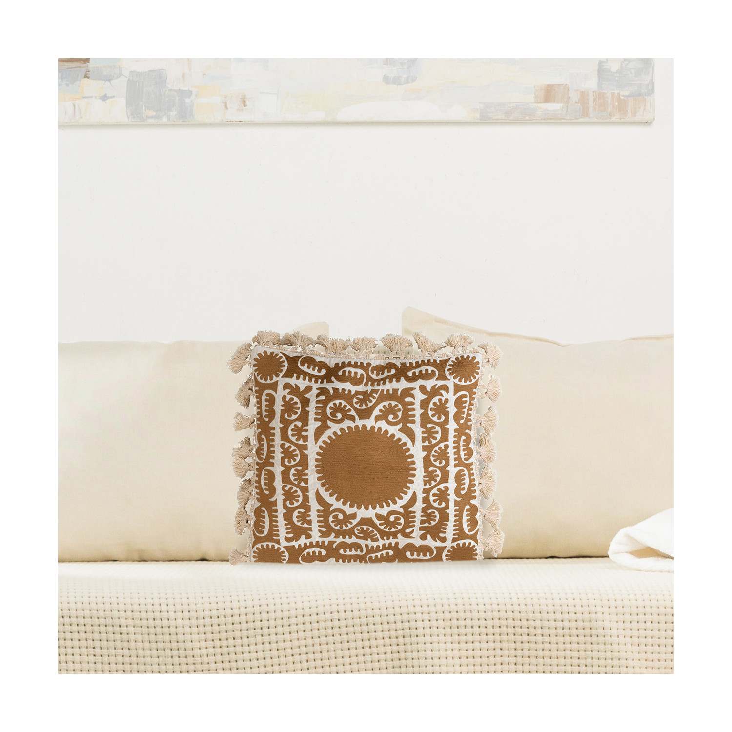 This global-inspired throw pillow cover features a bold pattern, intricately embroidered on cotton, finished with decorative tassels. Square gold and cream cotton throw pillow with embroidered print and tassels; Cream cotton encasement on back. Express your constantly evolving style with the simple addition of this eye-catching pillow. Removable cotton throw pillow cover with polyester insert; Back zipper with hidden flap; Machine wash or hand wash.