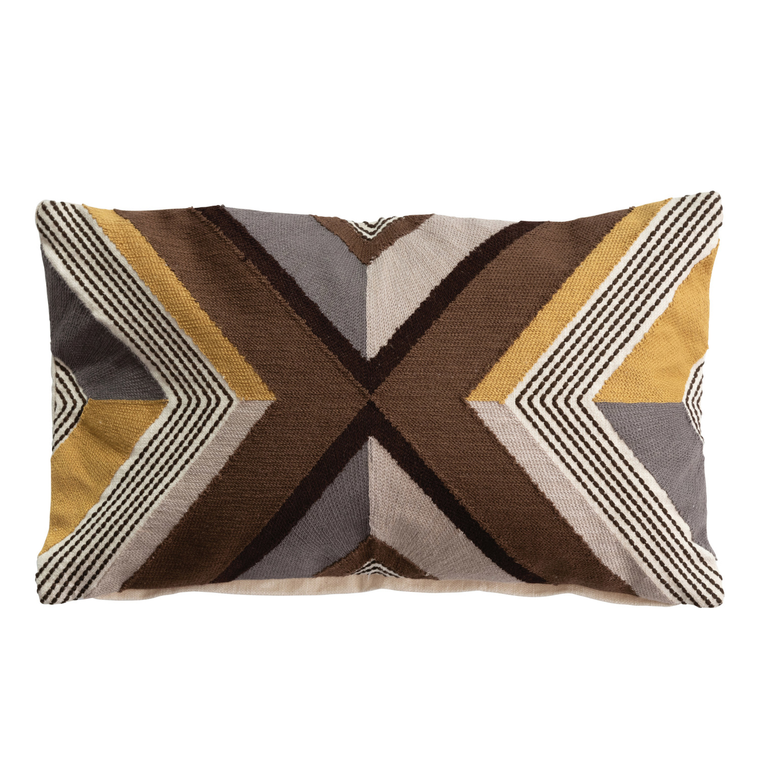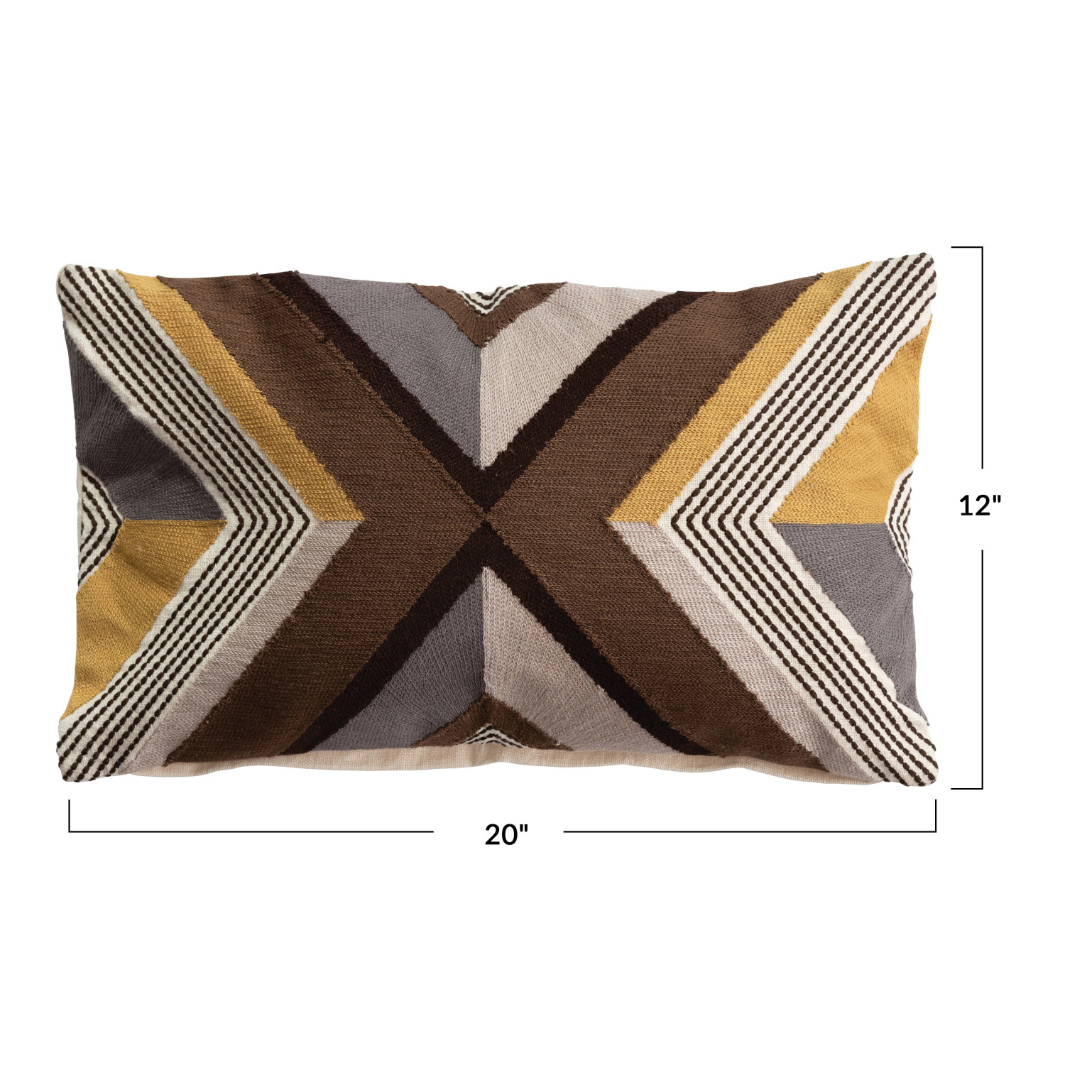 Multicolor cotton embroidered lumbar pillow with geometric design. Machine Wash Warm, Gentle Cycle, Do Not Bleach, Tumble Dry Low, Warm Iron if Needed. Prop 65 Compliant.