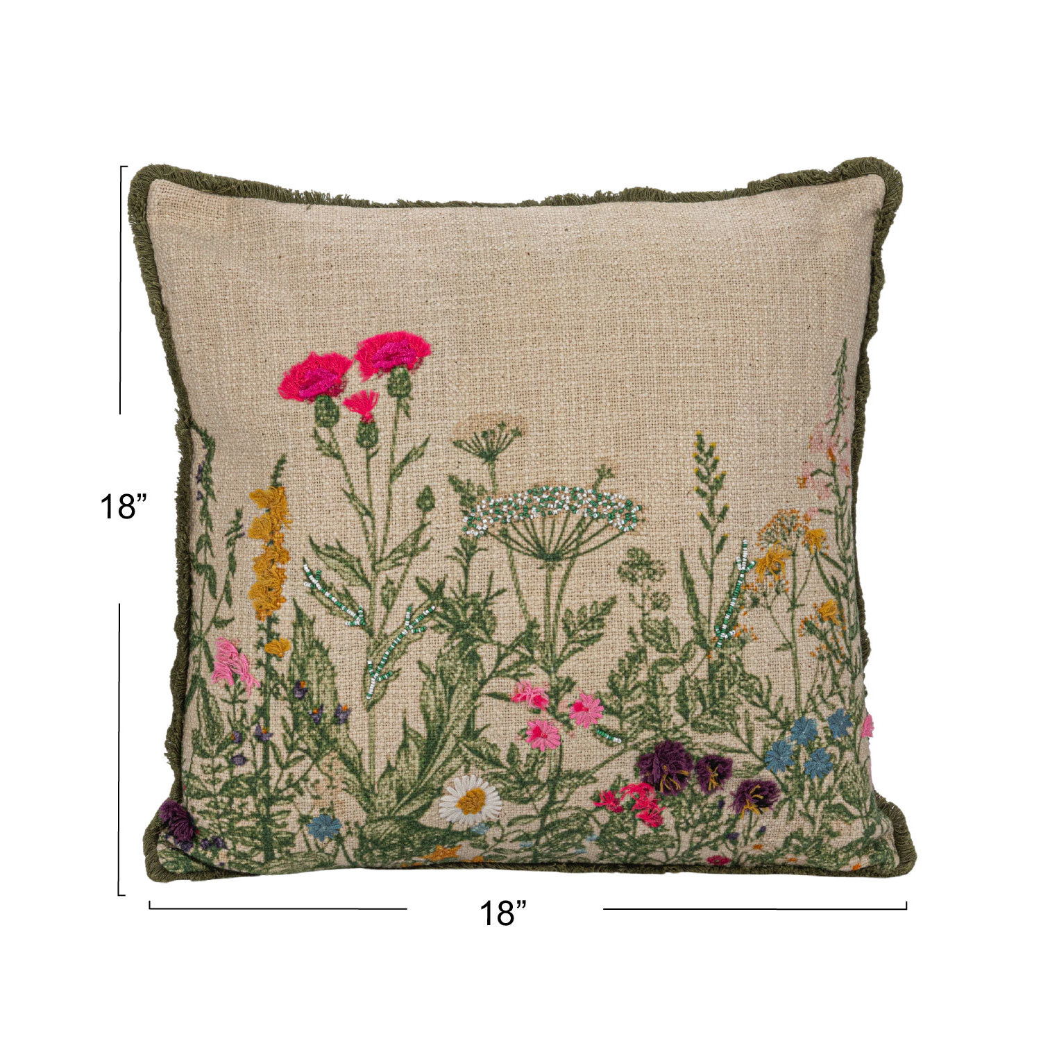 Catalog Name: 18" Square Cotton Slub Printed Pillow w/ Flowers, Embroidery, Beads & Eyelash Fringe, Multi Color