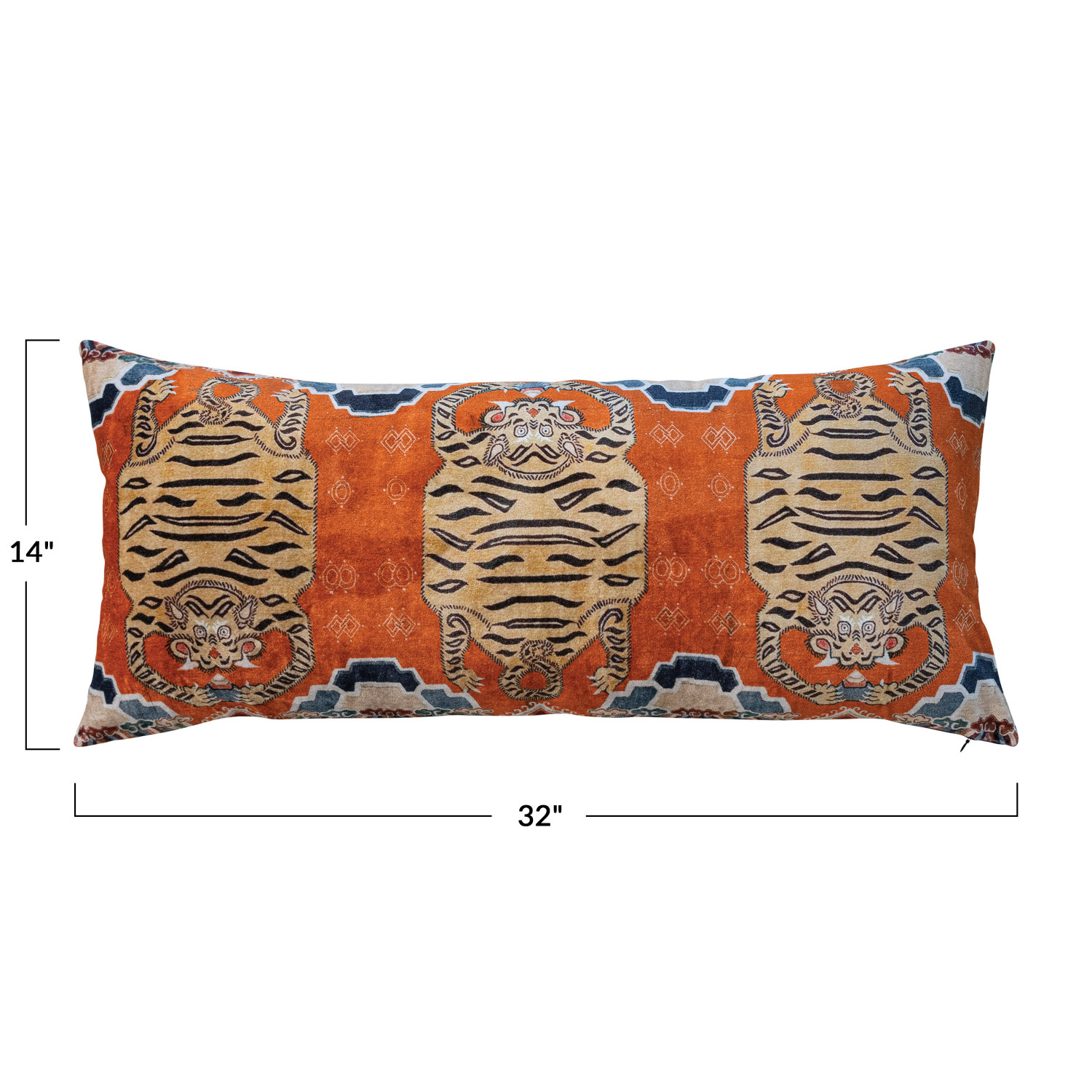 Catalog Name: 32"L x 14"H Cotton Velvet Printed Lumbar Pillow w/ Tibetan Tigers Pattern & Cotton Back, Multi Color
