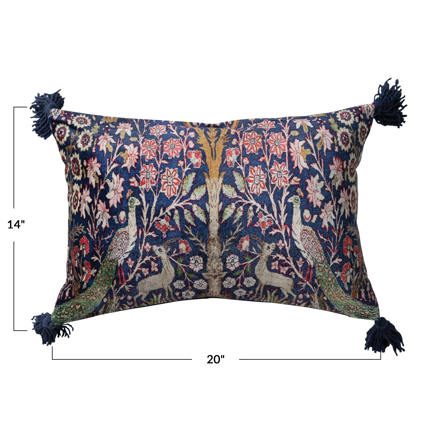 Catalog Name: 20"L x 14"H Cotton Velvet Printed Lumbar Pillow w/ Woodland Pattern & Tassels, Multi Color