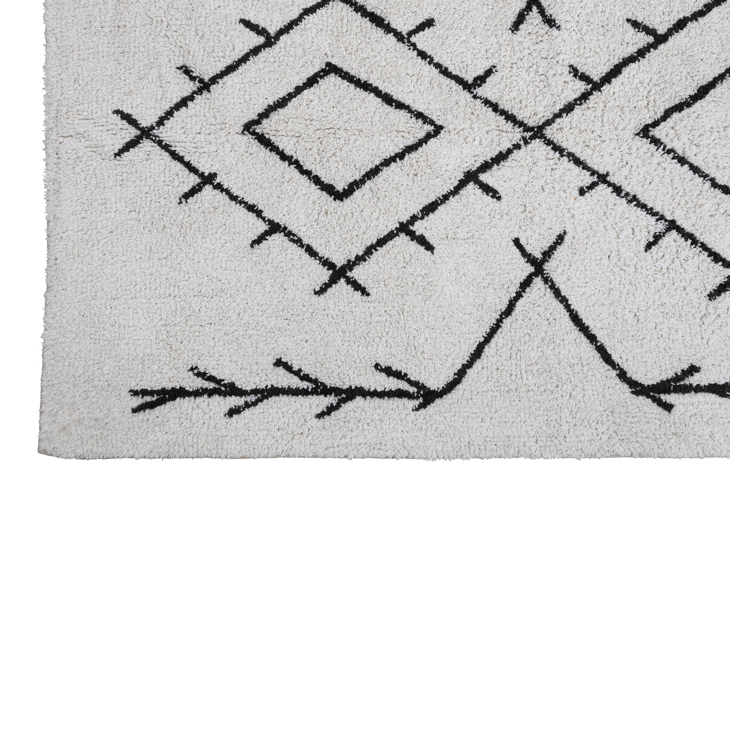 This modern boho rug showcases a geometric print on soft tufted cotton. Black and white tufted cotton geometric print rug. Spot Clean Only. 97% Cotton, 3% Other Fibers.