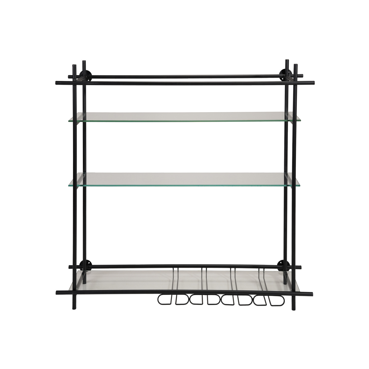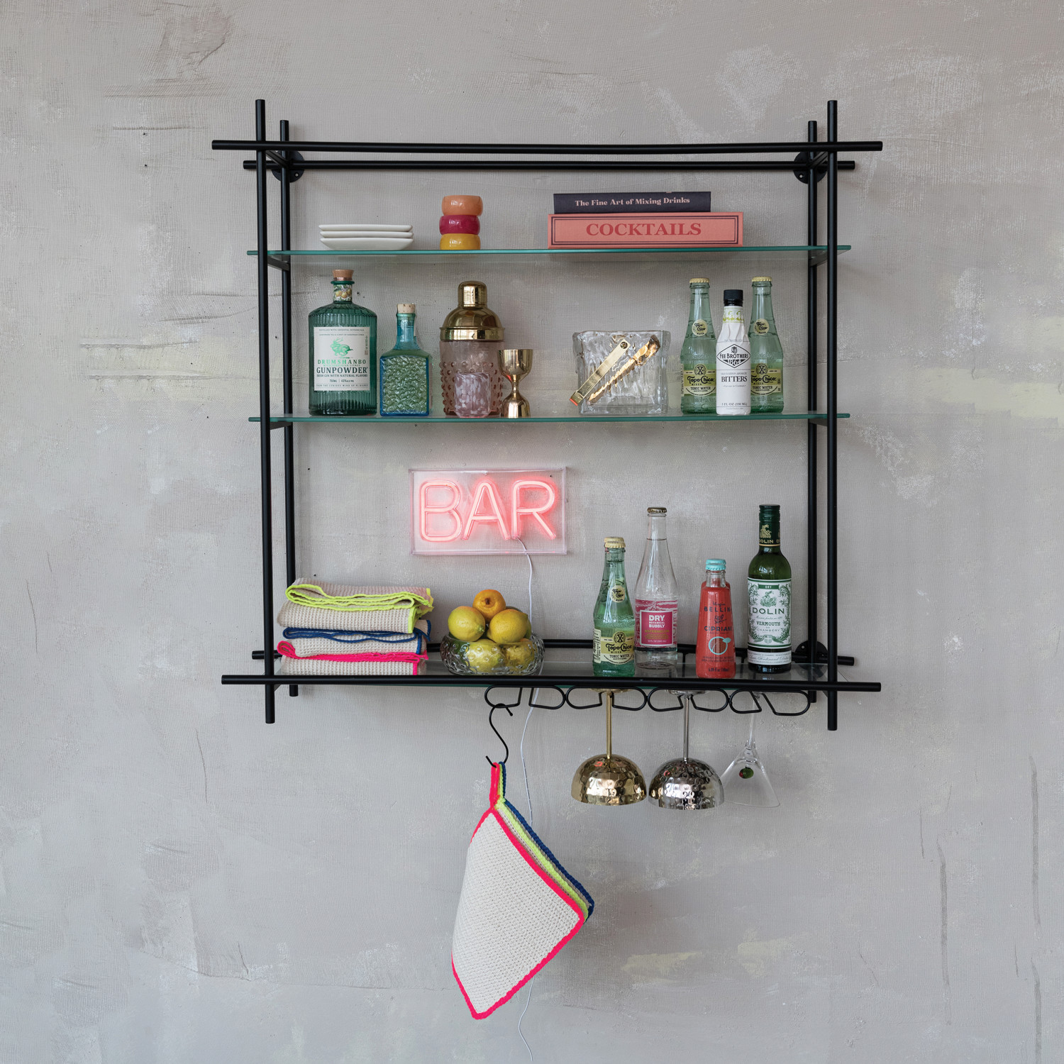 Catalog Name: 35"W x 9"D x 33-1/4"H Metal & Glass Wall Shelf w/ 3 Shelves & 4 Stemmed Glass Holders, Black, Truck Ship (Holds 8 Glasses)